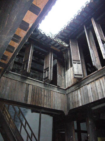 徽州民居の外観は白壁で高い外壁で囲まれ、正面中央にある大門以外の開口部は小さく、少なく、閉鎖的な表情をしている。大門をくぐり住居内に入るとすぐに2階の屋根が切り取られた「天井」といわれる部分から光が差し込んでくる。屋根は無いから雨は住居内に落ちてくるいわゆる中庭のようなところである。この中庭を中心に諸室が配置されている。内部の構造は外観から見る組積造とは異なり、木造軸組構造が自立している不思議な内観をしている。又、中庭まわりの建具には精巧な彫刻が施され、細密につくられた印象のする住居内部である。