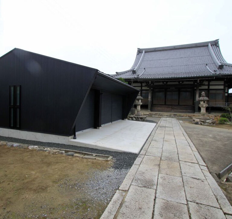 ・揖斐川沿いにある寺院境内に計画する住まいである。・新たな住まいは既存車庫の位置に建築するため、先ず車庫を解体 …