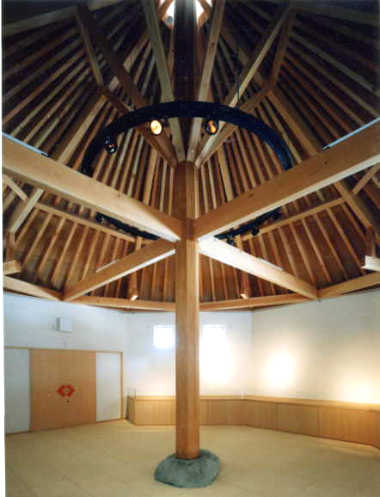 近くにあるグリーンドーム又、キャンプ場など公園の喧騒の中にあり、敷地面積の限られた美術館である為、周囲とのかい離と、自然との対話のできる空間づくりをめざした。