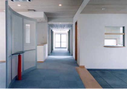 展示室の間には、休憩スペースをとり、水面に浮きながら静かに遠方の伊吹山と対話できる形としている。建物まわりの自然をかい間見ながら、建物を周遊する建築。