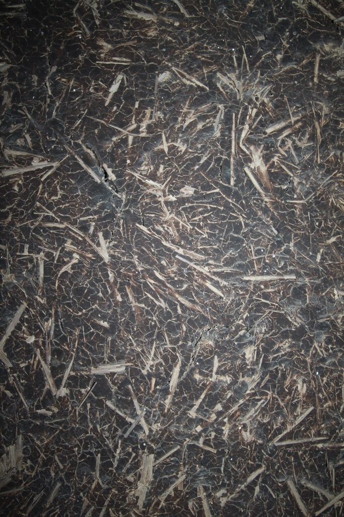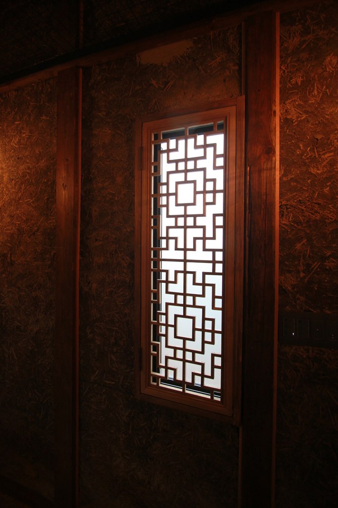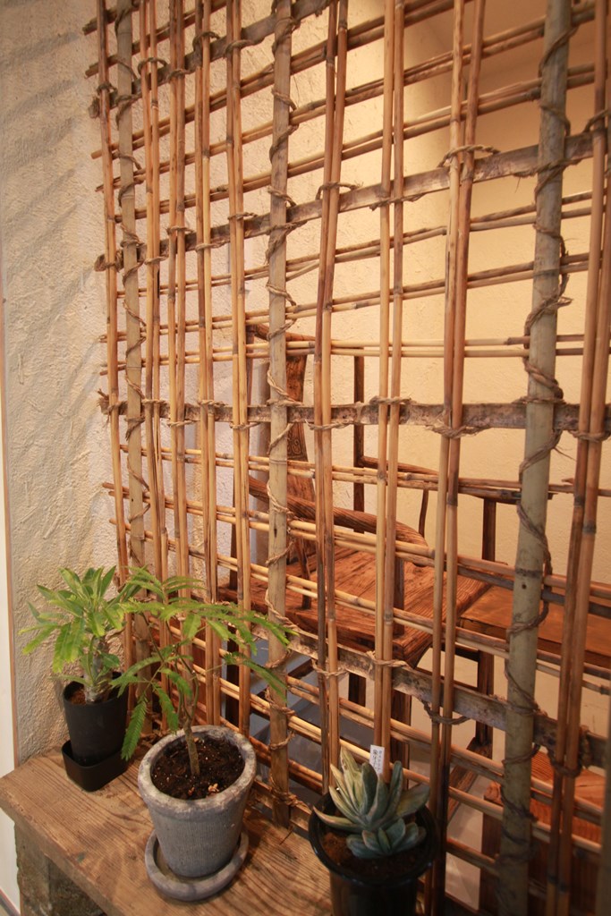 内部解体時に切り取った土壁の土のみを落し、あらわれた小舞(ヨシ)を洗いスクリーンに利用している。荒壁の小舞は一般的に割竹で組まれるが、建設地は琵琶湖に近く、小舞は葭(ヨシ)で組まれている。
