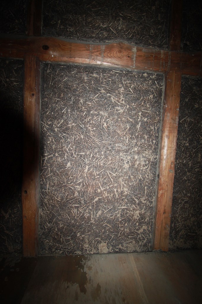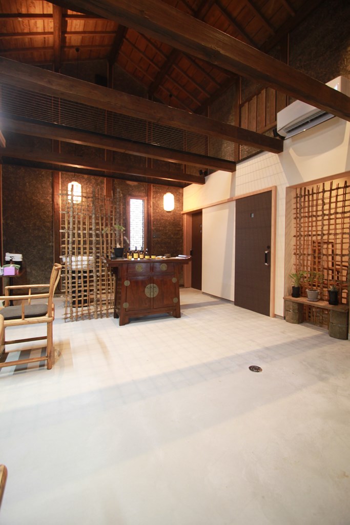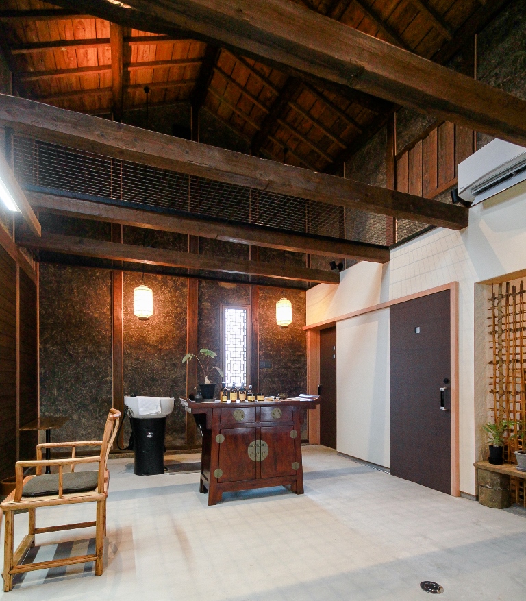 その改修予定の中2階(ツシ)へ上り、暗闇の中で出合った荒壁の美しさに感動し、店舗の内装としてそのまま手を加えずあらわしにしている。