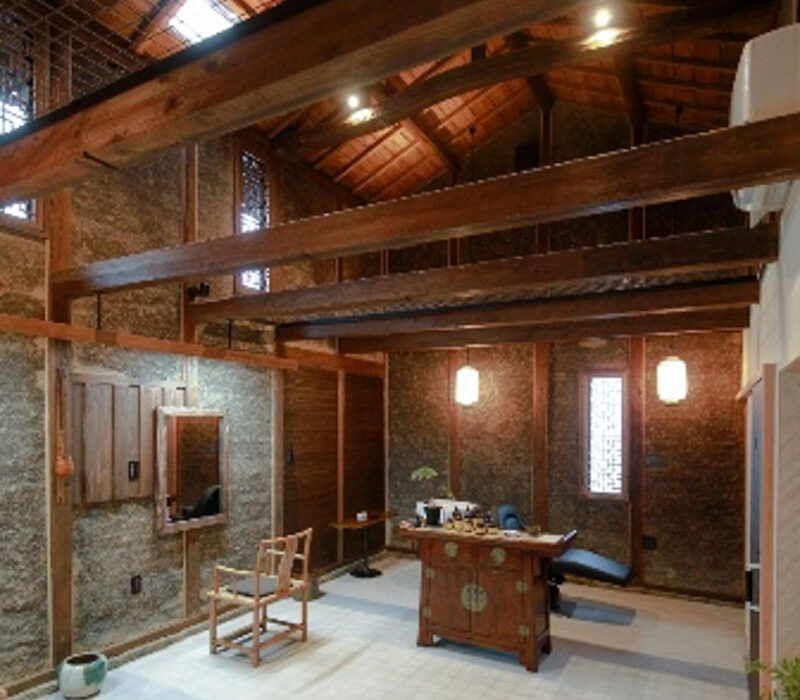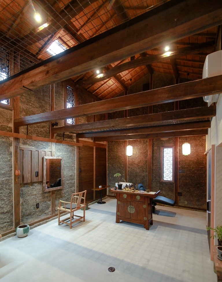 店舗内には地域の民家のつくりを特徴的に表す部分(荒壁)もあり、それをカットスペースの前に補修の手を加えずそのままあらわしとすることで、地域の家づくりの仕組みを紹介している。