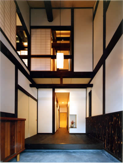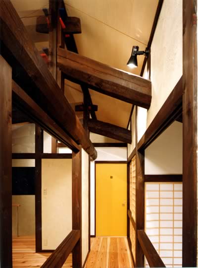 現代の車社会では、住居を建築する場合には当然、家前面に空地を取り駐車場とし、軒高は高く取り「たて」にも広がりを持った充分な居住空間を得ることが、常識であると言える。今回は、その2点をあえて取り止め、まちの景観へ配慮することとした。(軒高が低くても充分な居住室間を得るために、梁をあらわす・吹抜けで上下をつなげる等の工夫をしている。)