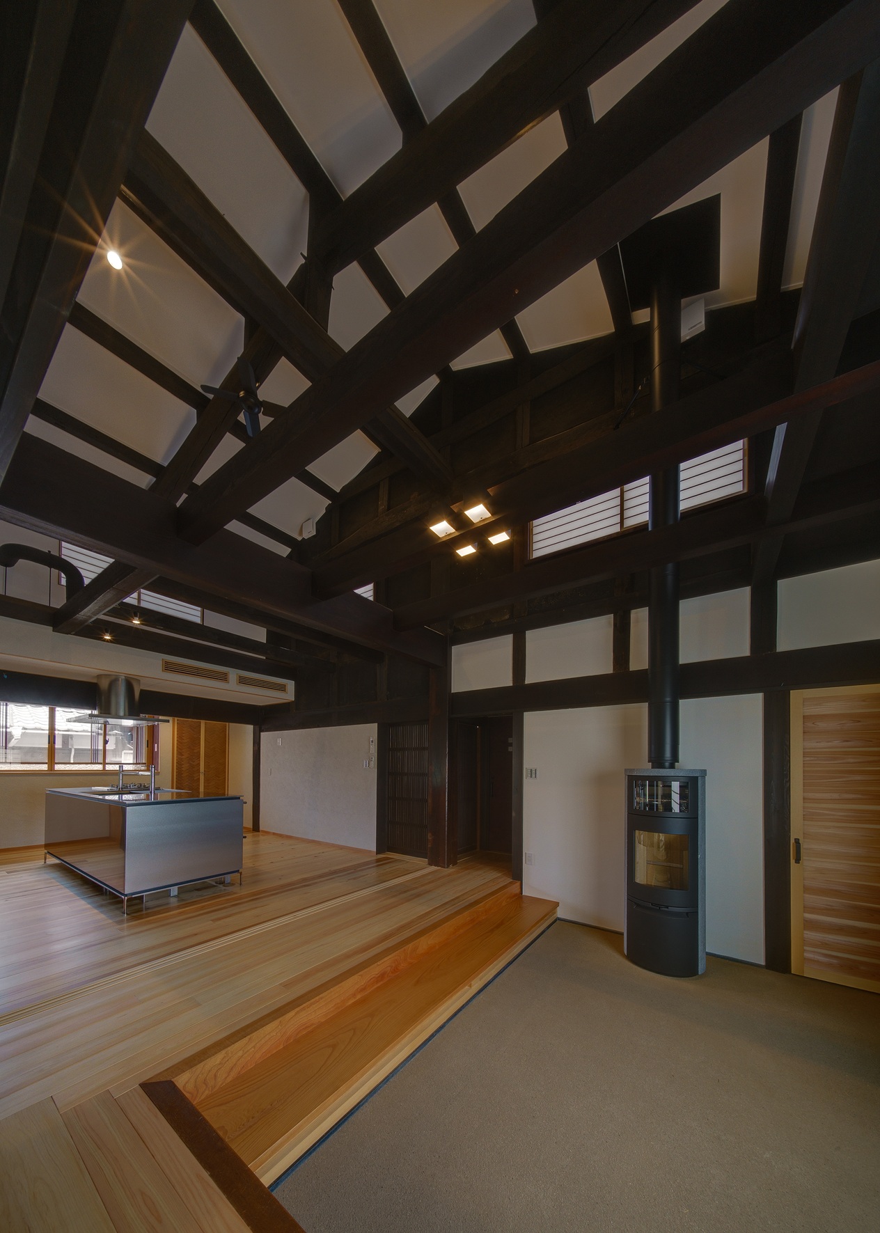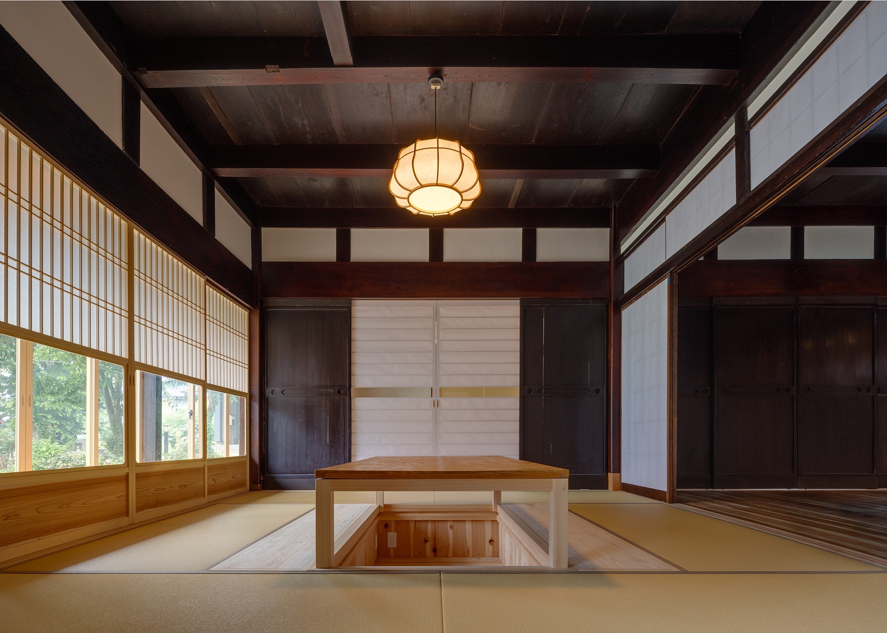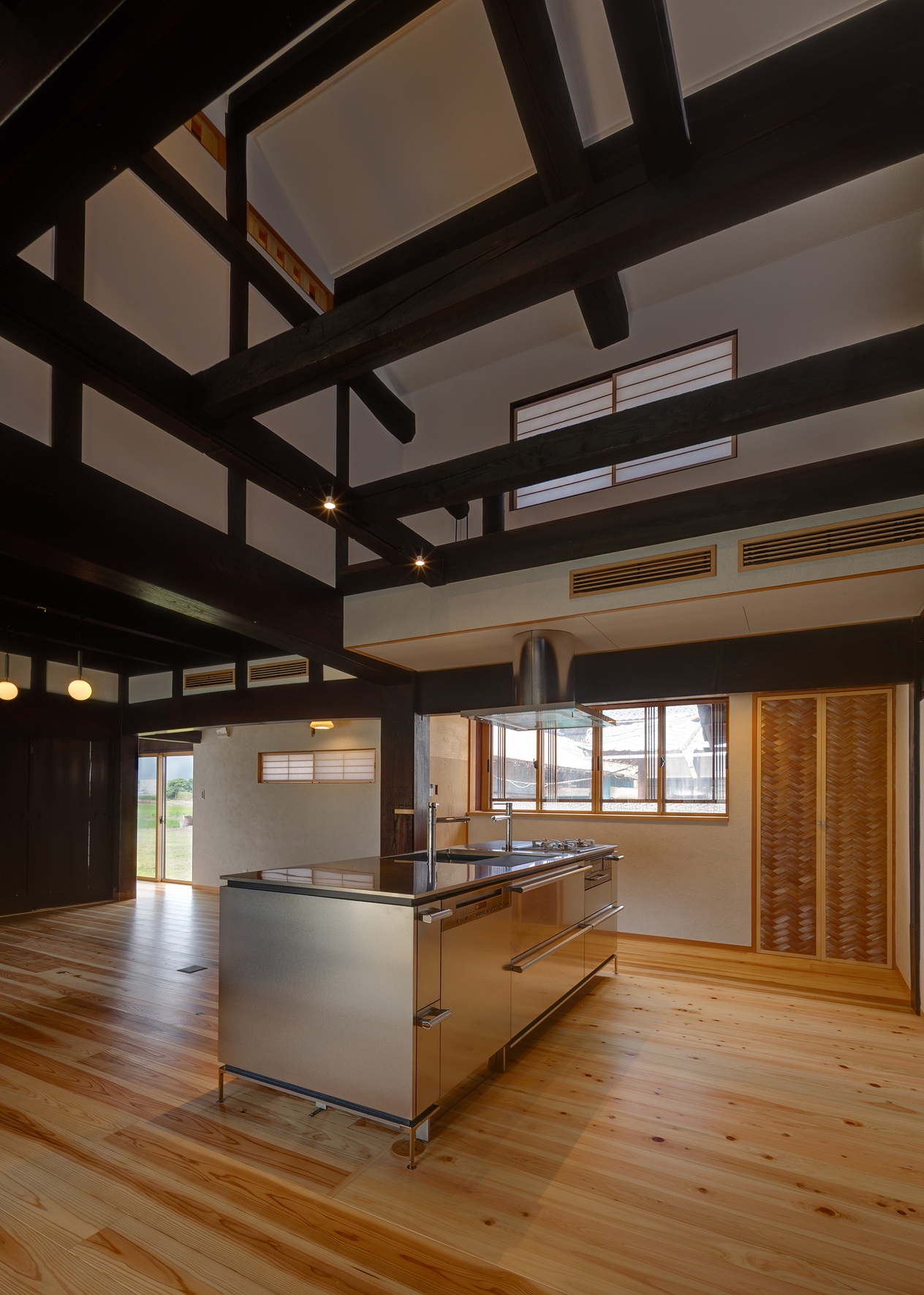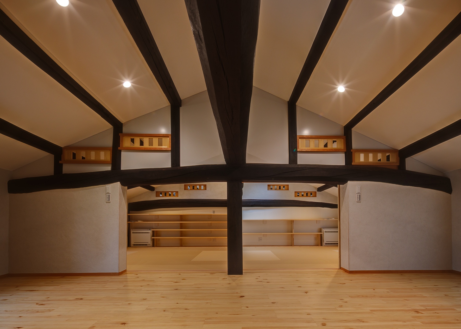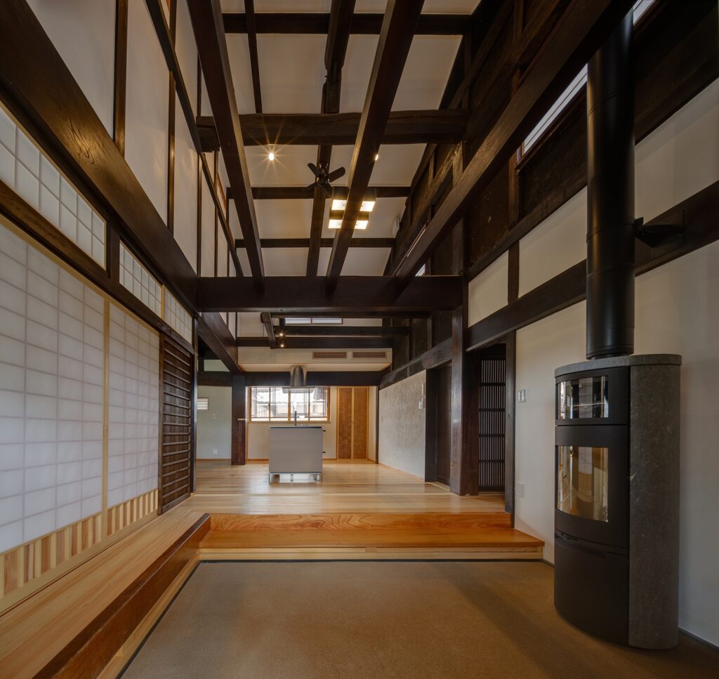 今回の改修で、2階の小さく間仕切りされていた室はなくし、建具を開けると大空間としてつながる民家の間取りを活かしたものとしています。