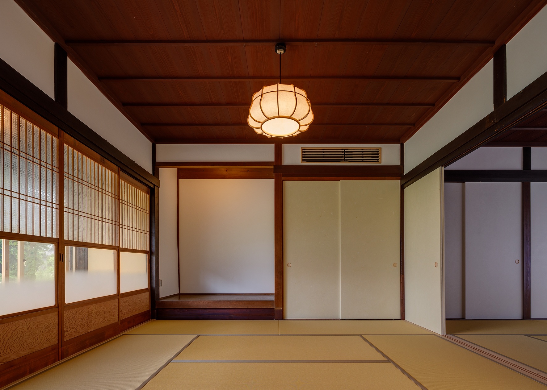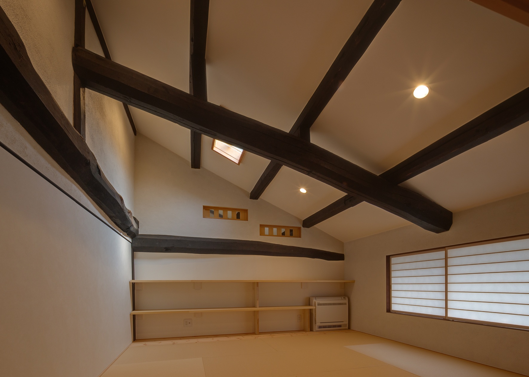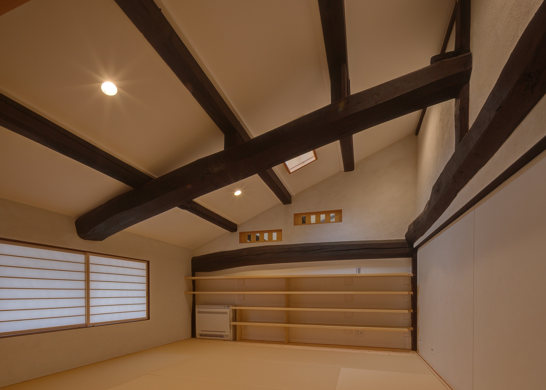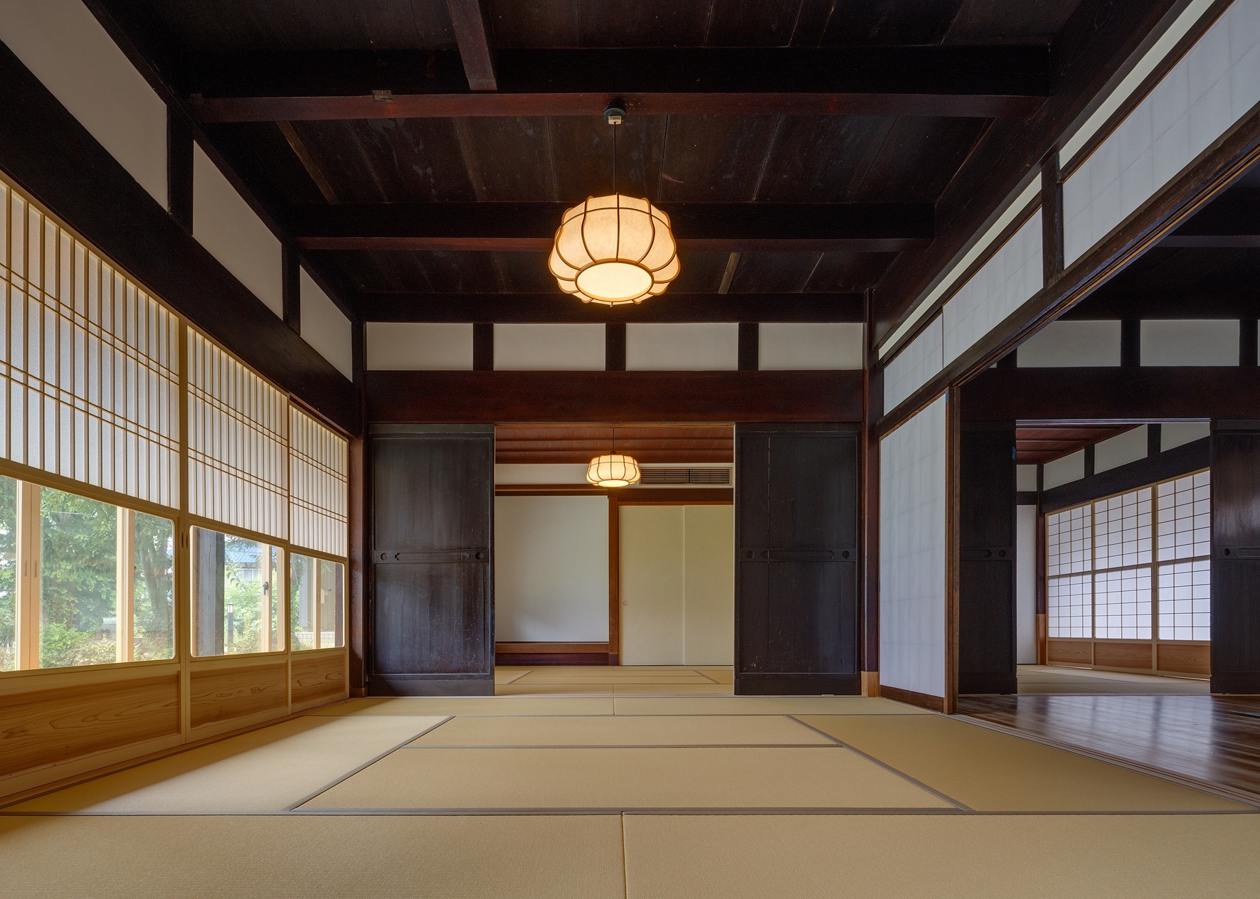 今回の改修で、2階の小さく間仕切りされていた室はなくし、建具を開けると大空間としてつながる民家の間取りを活かしたものとしています。