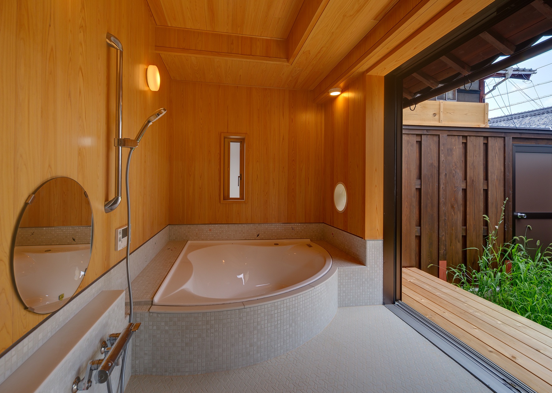 建物は週末にセカンドハウスのように使用されるため、内部は非日常な大空間としました。また、浴室には大浴槽を備え、外部との仕切りはすべて引き込み戸として、屋外へとつながる露店風呂の雰囲気を楽しめるようにしています。