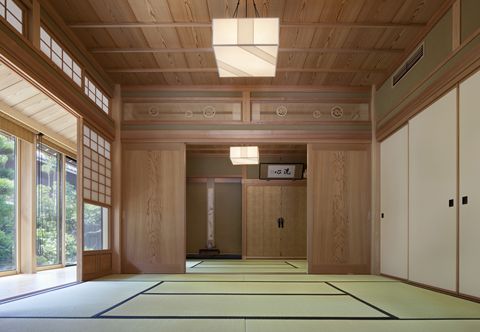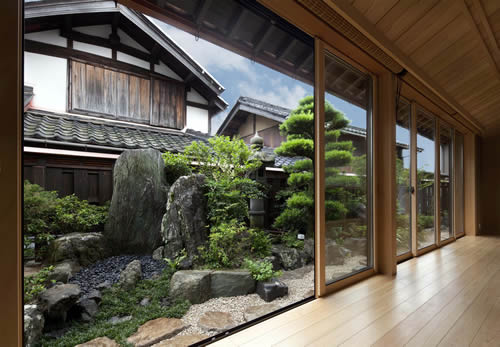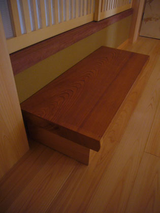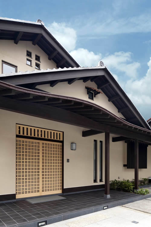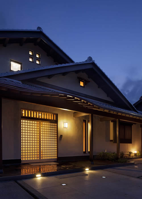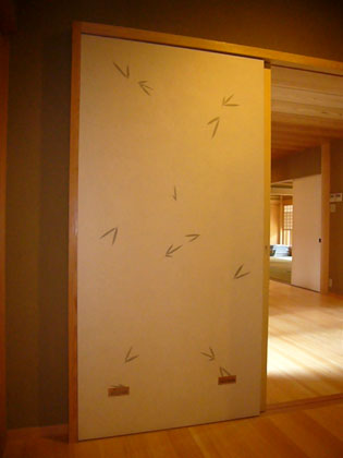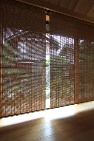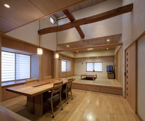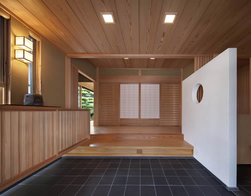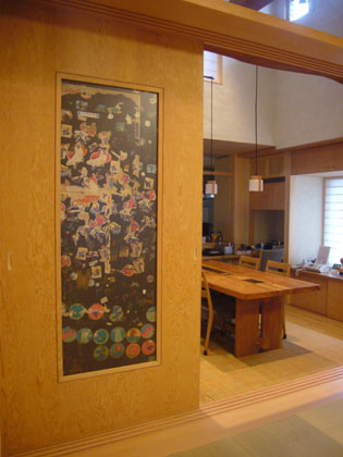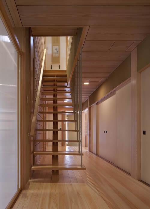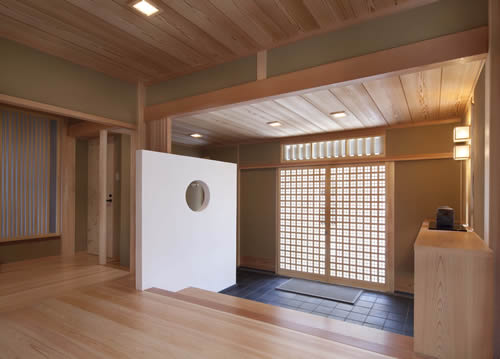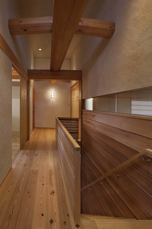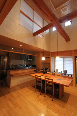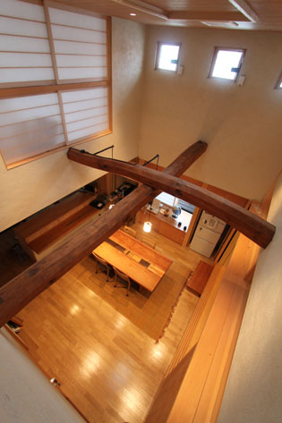 旧家屋の記憶を引継げるよう、旧家屋(納屋)の小屋組みの一部松梁を吹抜に再使用したり、旧床の間の地板、通柱、又想い出の建具の一部を新住居の各所に埋め込んでいる。木と土を和紙を多用した住まいは、呼吸する空間となり、大きく開けた窓は、自然と触れ合い、心地よい風がいつも流れている。