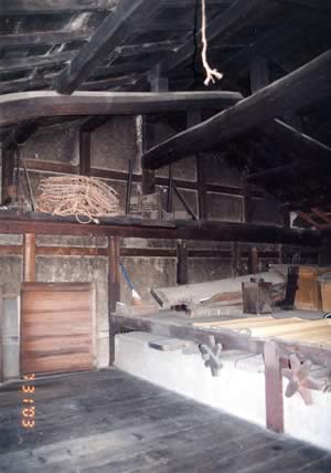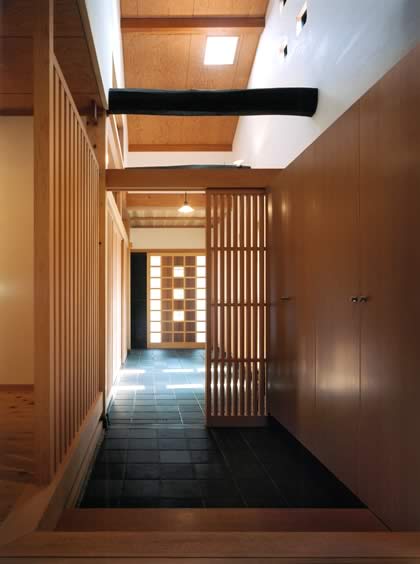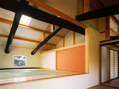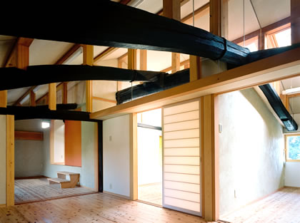 既存民家の軒高は『丈五』と呼ばれる軒高4.5mの上屋の低い建築であり、2階はツシとして使用されていた。2階ツシの軒桁は2階床レベルより1.7m程度であり、生活空間として機能しないため、既存軒桁に30cmの桁を載せて桁高を上げ、生活空間の確保をおこなった。既存の小屋組を残したまま、屋根面を持ち上げる非常に難しい工事を克服している。