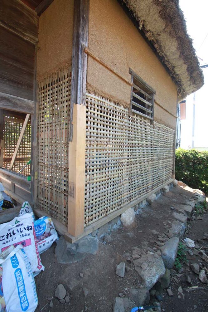 根継した柱と土壁の下地となる竹小舞組み