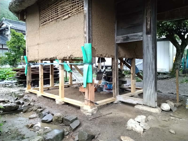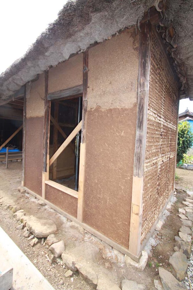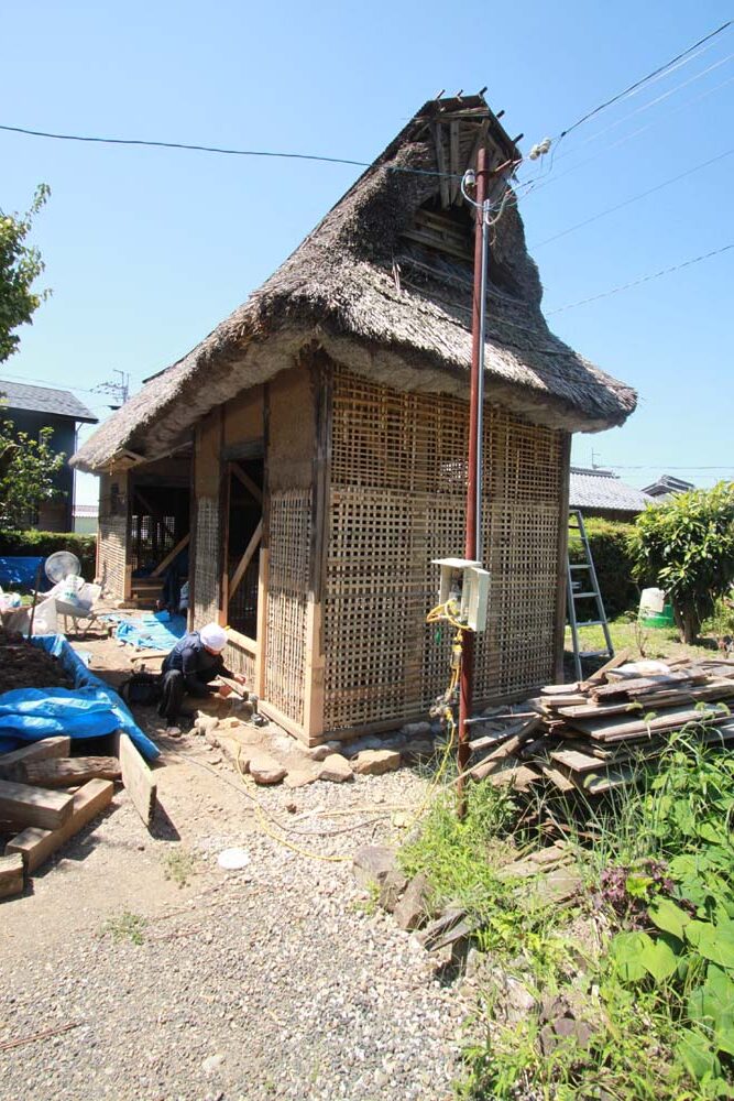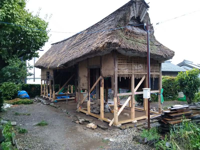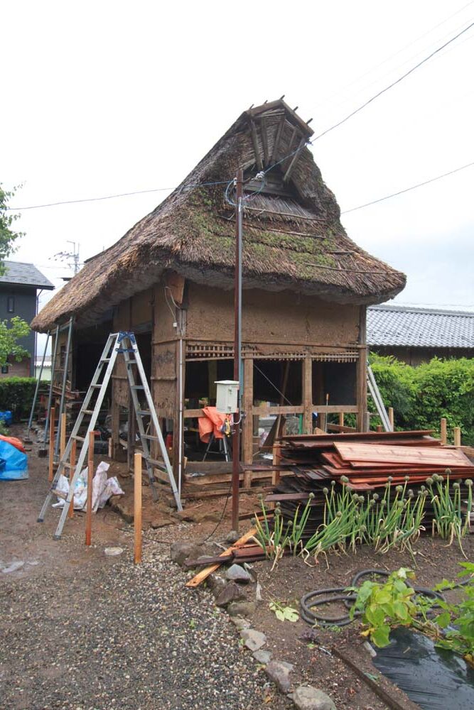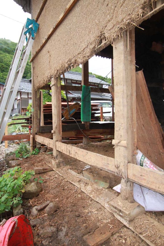 今回は建物の不陸・建て起こし・柱の根継・土壁、軸組の修復をおこなっている。来年、屋根の葺き替えを、ボランティアを混えて行われる予定である。