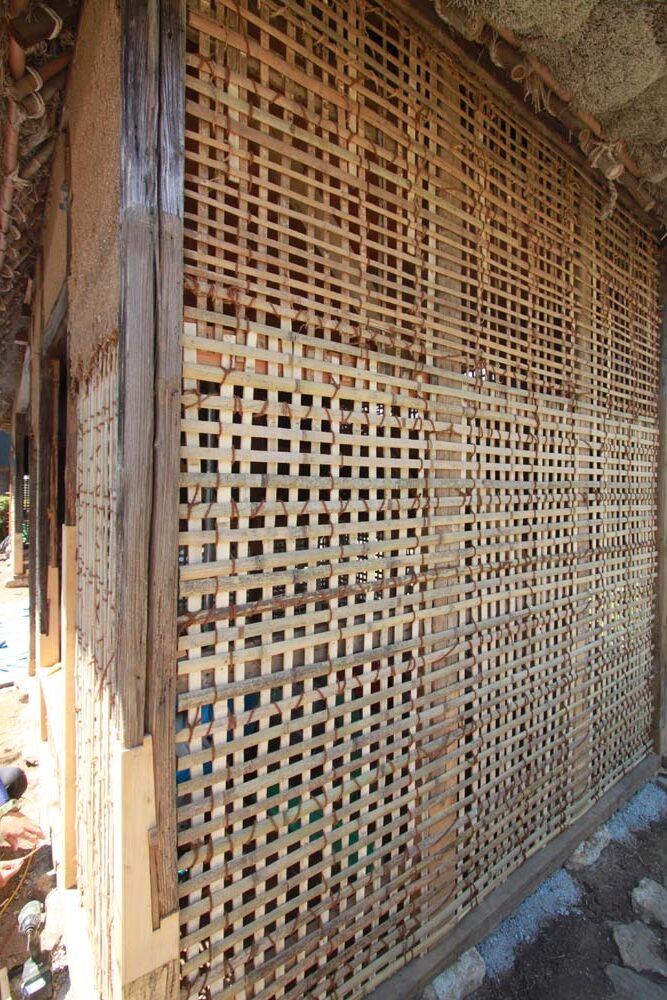 竹小舞組み、上段の濃い色の竹小舞は既存のまま残した部分。下段の白い竹小舞の部分は今回新設した竹小舞。