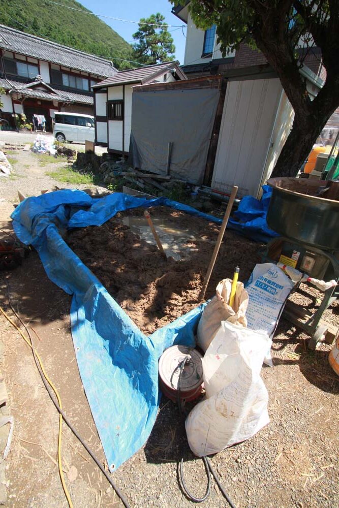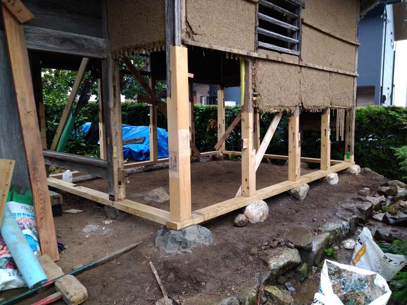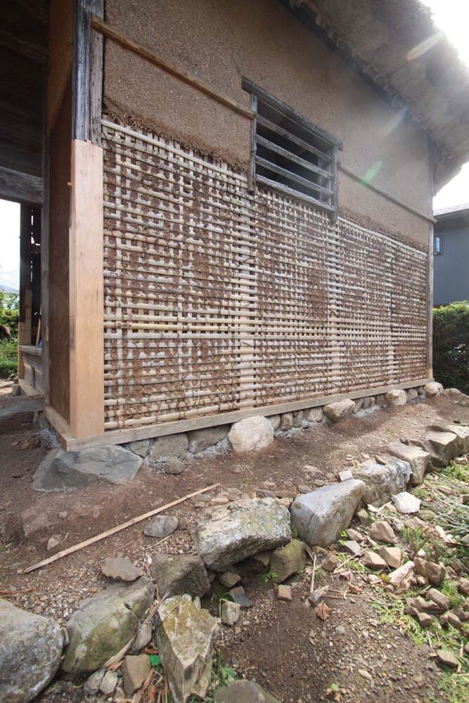 竹小舞の内側より土壁塗りした状況。柱下の礎石と礎石の間は差し石して土台を支えている。