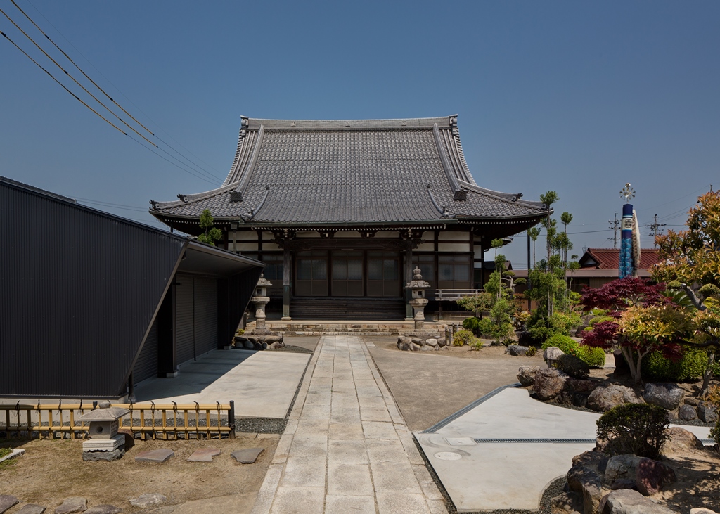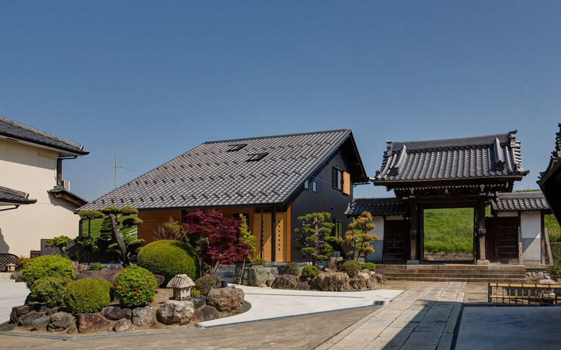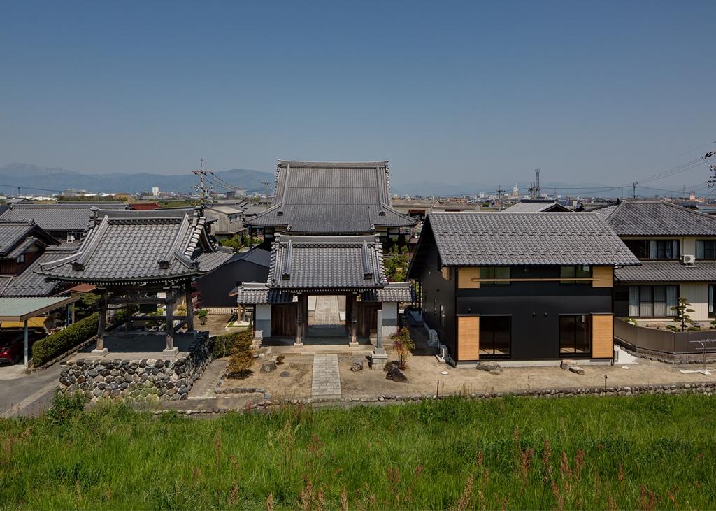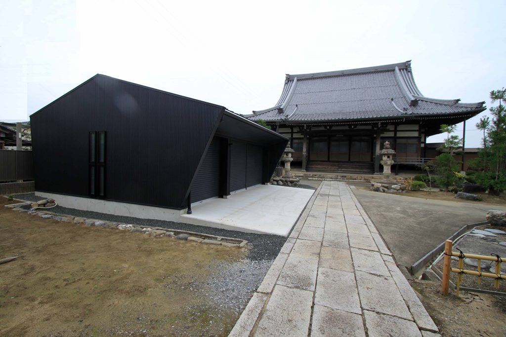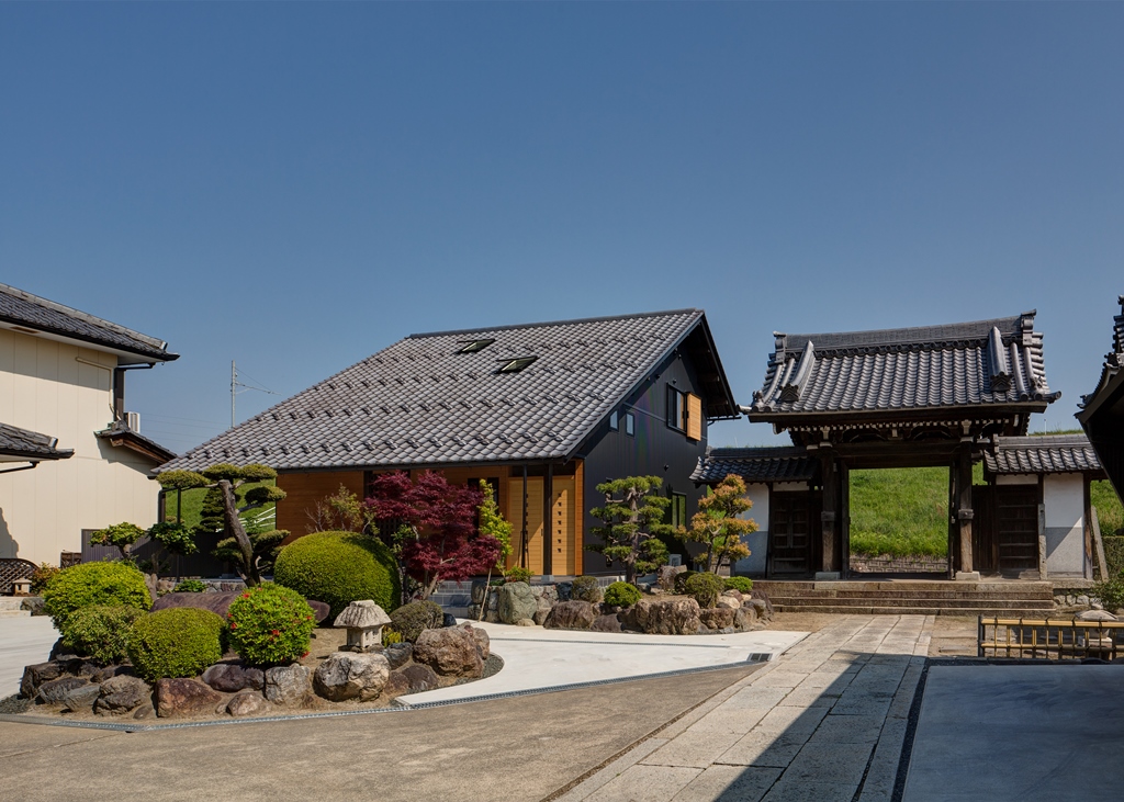 ・本堂の持つ伝統の形である少し勾配の強い大屋根と向拝にある列柱のシステムを新たな住まいに採用して、境内で建築する住まいとしての調和を保つよう計画している。