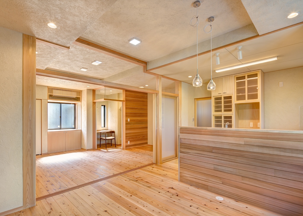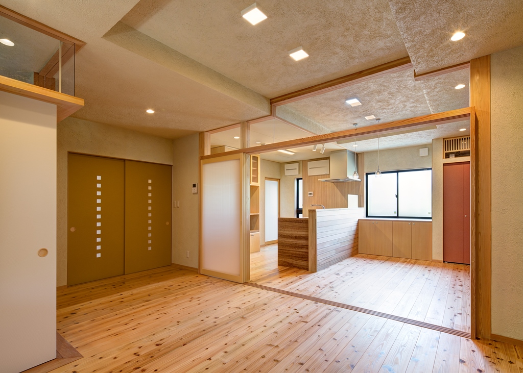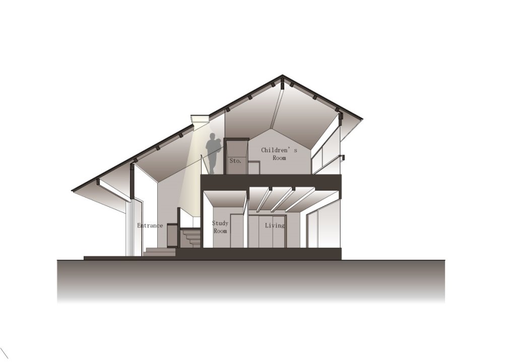 - 本堂の持つ伝統の形である少し勾配の強い大屋根と向拝にある列柱のシステムを新たな住まいに採用して、境内で建築する住まいとしての調和を保つよう計画している。