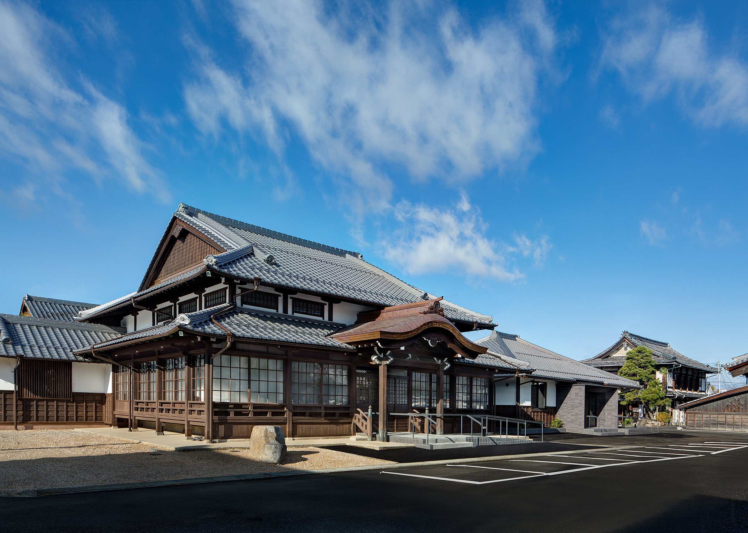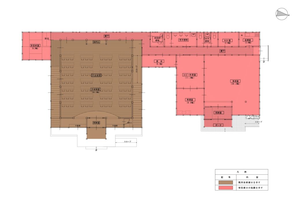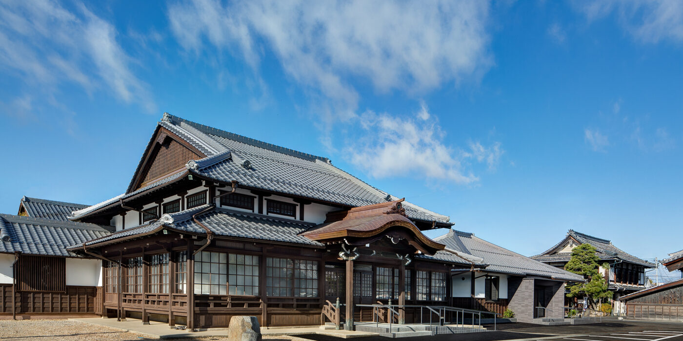 大谷会館は建築から約90年が経過していた。大通寺境内整備の一環として大谷会館の修復、事務棟の新築がなされた。修復棟と新たな機能が付与された新築事務棟の融合した建築である。