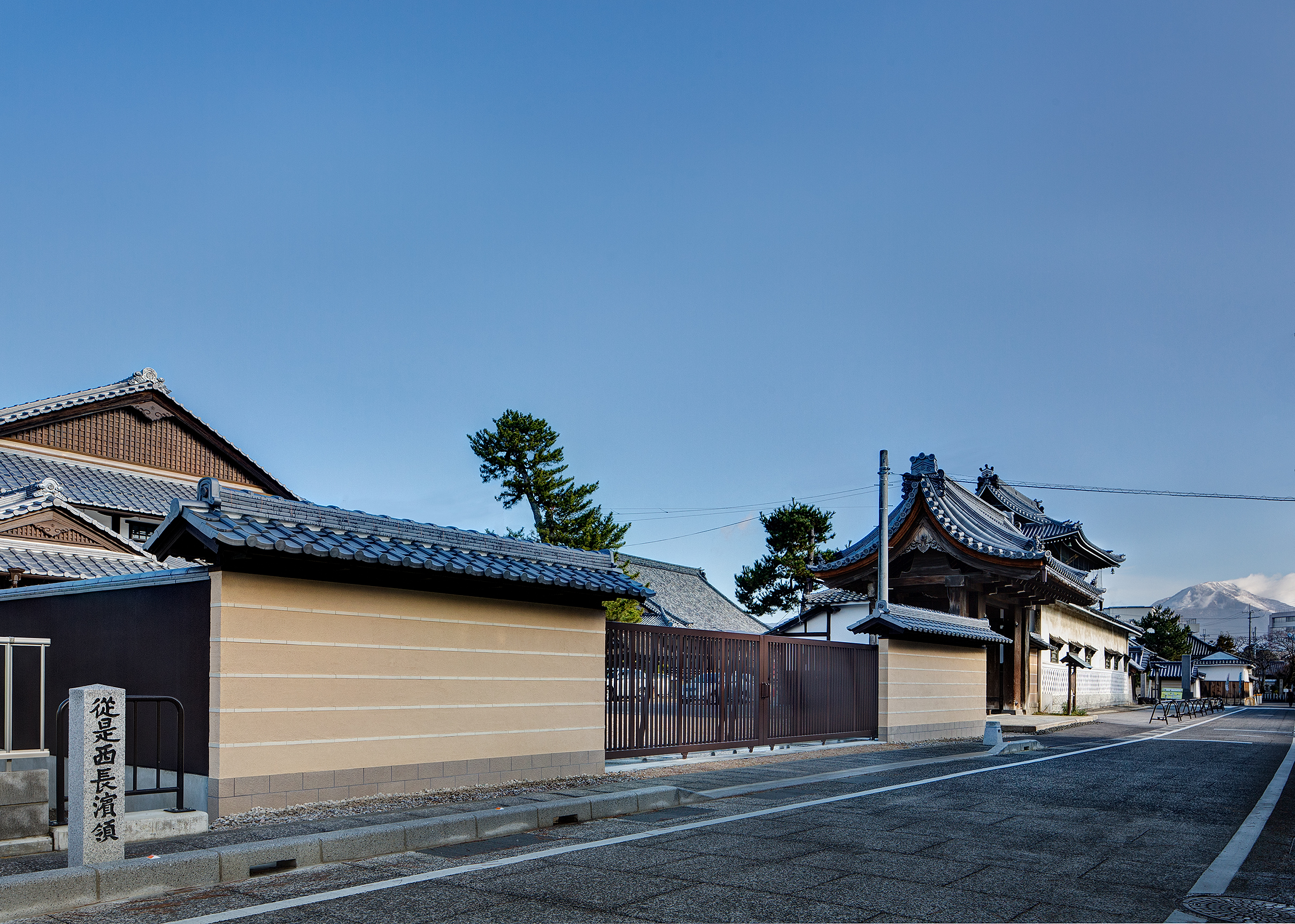 大谷会館の改修に併せて手前の5条線入りの塀を新たに設けている
