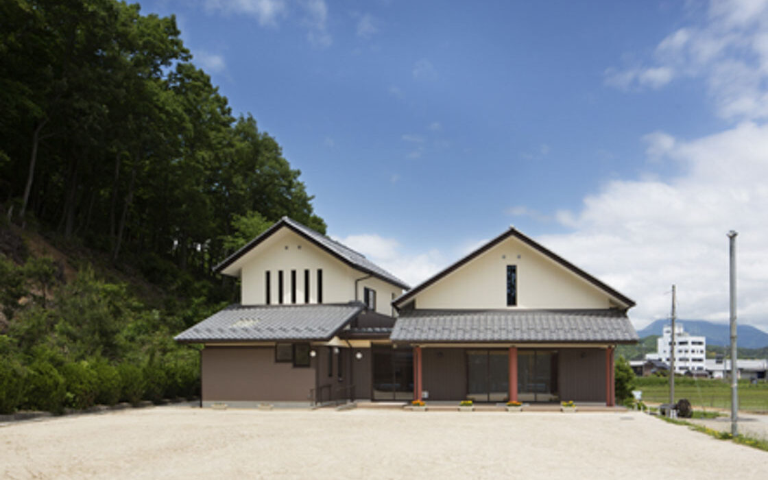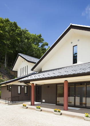 公民館が西円寺の集落の景観に溶け込むように、またグランド用地を出来るだけ確保する為に、集会室棟とその他諸室棟を分節してつなげ、建物全体が大きなボリュームとならないように配慮している。又、外部の丸柱には、地域の伝統色である紅柄色を取り入れている。