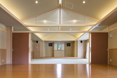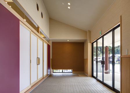 区民グランドに隣接して建築されることから、公民館がグランドと一体となって活用されるように、玄関と通り庭形式でつながる玄関土間の大きな間口でグランドに接する設計となっている。