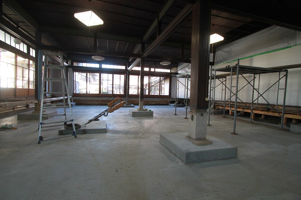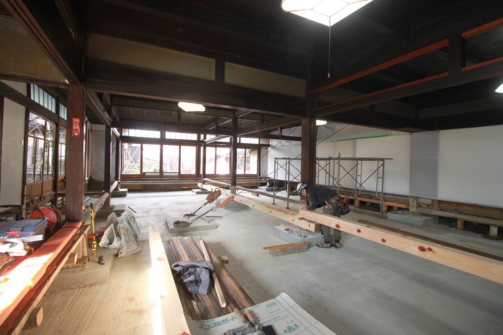 庫裡は時々に建具を取りはらい、一室の空間として使用できることが要求されたため、耐力壁の配置は取り止めて、足固め等の最小限の耐震補強を施して、主目的である屋根の葺替えをおこなうことになった。