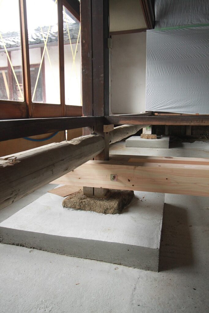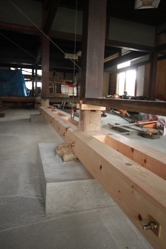 建て起こし用の基礎を設けて建て起こしをおこなっている 又、既存の礎石まわりはコンクリートにて包み補強している。