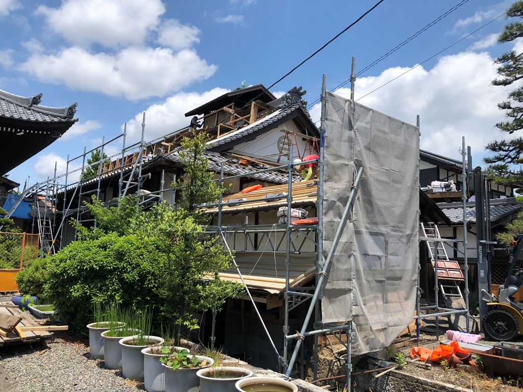 ■屋根瓦の葺替えにあたっては、下地垂木まで撤去し、レベル調整の上、小屋組を補強している。